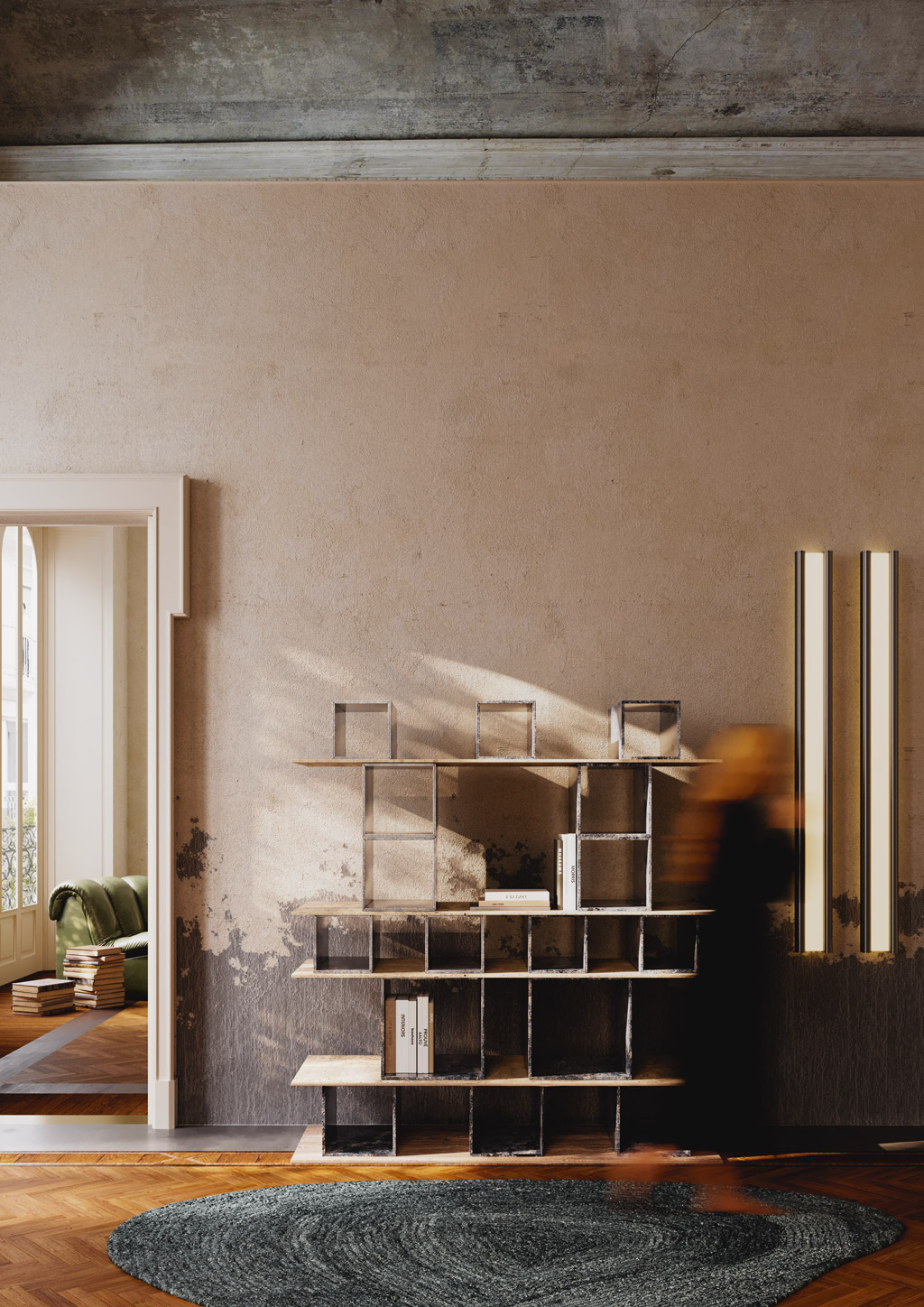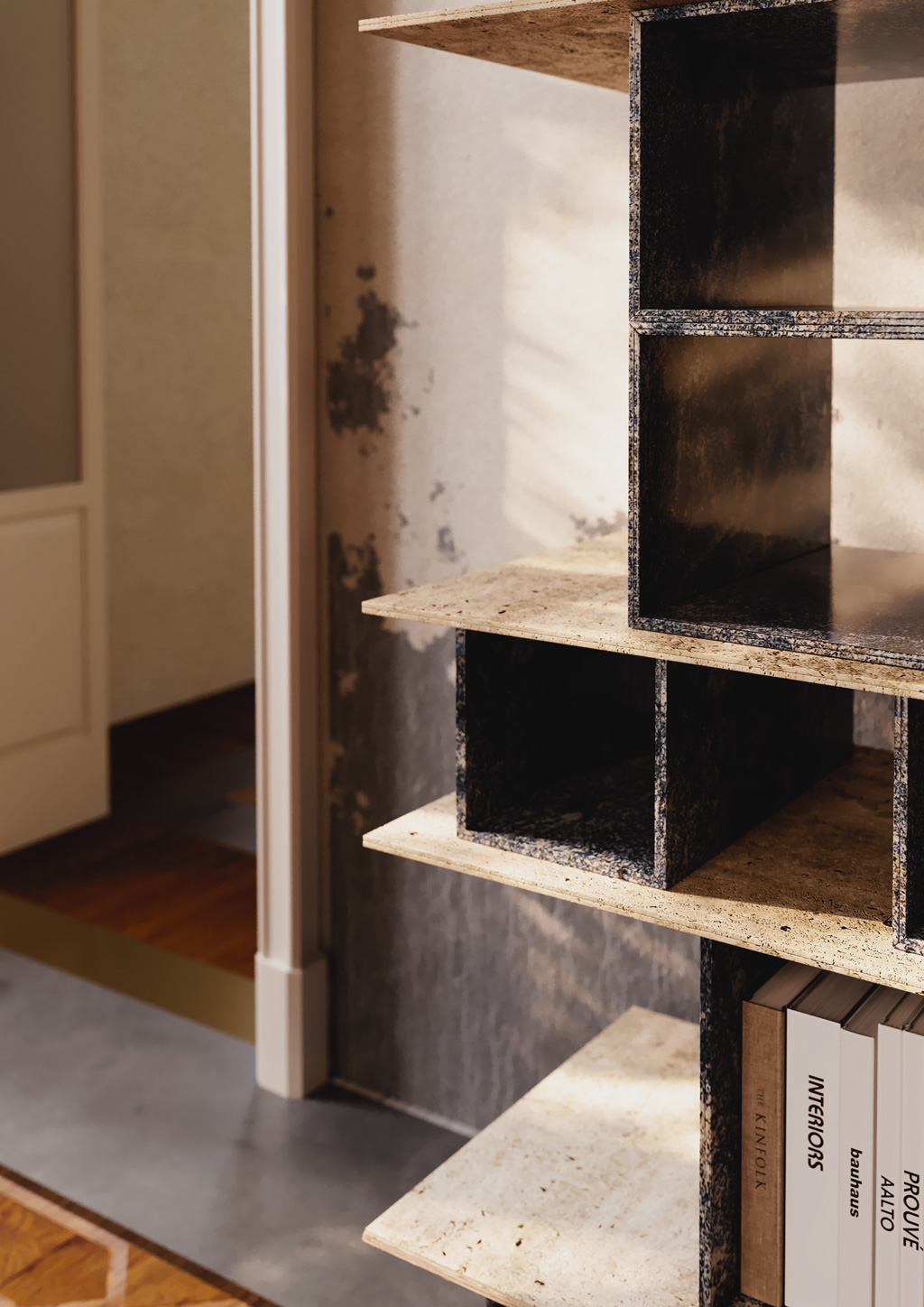 Libreria nella quale viene stravolta la classica concezione che si ha del marmo: da materiale pesante e delicato diventa leggero e tenace, permettendo la realizzazione di geometrie che prima d’oggi sarebbero considerate assolutamente ardite. I cubi che poggiano sulle mensole orizzontali conferiscono all’arredo un tono delicato e armonioso, oltre che un piacevole rigore stilistico.